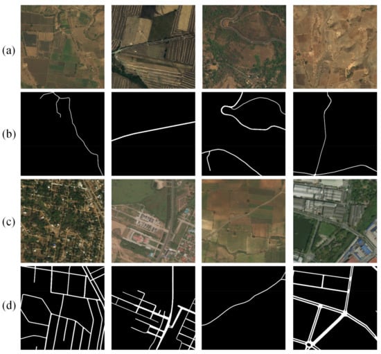The DeepGlobe road dataset [39] is a set of high-resolution remote sensing images proposed by the DeepGlobe Road Extraction Challenge 2018; the images all have a size of 1024 × 1024 and a spatial resolution of 0.5 m, among which there are 6226 images with labeled data. The image sceneries are from three countries—Thailand, India, and Indonesia—including urban, rural, deserted suburban, seaside, and tropical rainforest scenes. To verify the effectiveness of the algorithm proposed in this study, 6226 remote sensing images with labeled data were randomly divided into a training set and a testing set. Among them, 4696 images were used for training, and 1530 images were used for testing. The training dataset was augmented by creating crops of 512 × 512 [11,14,40,41,42]; some of the images in the dataset are shown in Figure 1.
