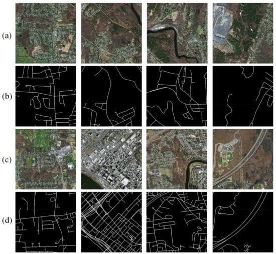 Further, the Massachusetts dataset is a high-quality aerial road imagery dataset that contains 1171 images (1108 for training, 14 for validation, and 49 for testing), which includes urban, suburban, rural, and other areas in Massachusetts. The images in the Massachusetts datasets all have a size of 1500 × 1500 and a spatial resolution of 1 m. In this study, the images were cropped to smaller sizes, of 512 × 512, with a stride of 512; some of the images in the dataset are shown in Figure 2.