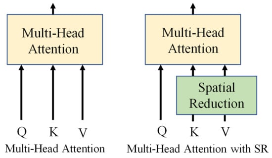 Vanilla transformer attention (left) and the spatial reduction attention (right) used in Seg-Road.