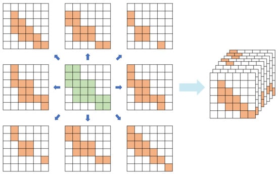 Therefore, to improve the accuracy of road segmentation, this article proposes the use of a pixel connectivity structure (PCS) to mitigate the fragmentation issue of road segmentation; the general process is shown in Figure 5; the output result of the PCS has the same resolution as the input image, with 8 channels. The PCS corresponds to the label generation steps, as follows: