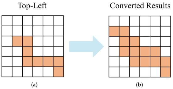 Reverse derivation of the PCS output to obtain segmentation results. ((a) is the output of the PCS representing the top-left connectivity and (b) is the result of the conversion of (a)).