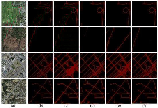 It was found that Seg-Road achieved good performance in the Massachusetts dataset, and Seg-Road-l achieved the best road segmentation result of an of 68.38% and MIoU of 83.89%, as shown in Table 4.