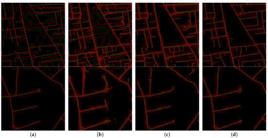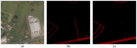 Further, it was found that Seg-Road trained using only the DeepGlobe dataset could achieve a good performance on remote sensing images of the Massachusetts dataset and vice versa, as shown in Figure 13.