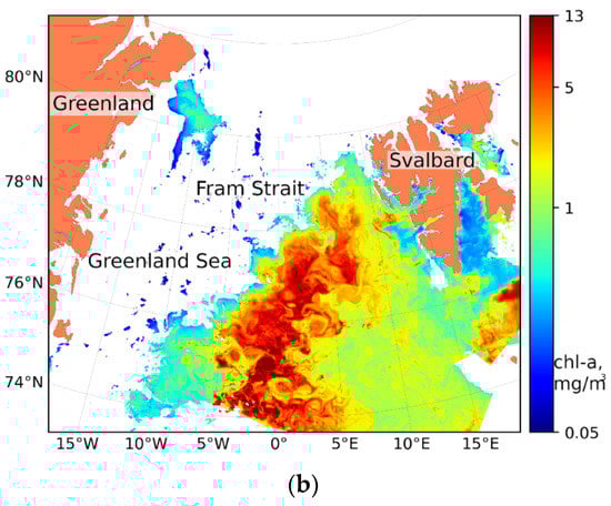 Most of them were observed in the Fram Strait and closer to Svalbard, and in the southeastern part of the study region (Figure 6b). A better visibility of eddies in chl-a data in the vicinity of the Spitsbergen west coast could be linked to the higher phytoplankton concentration in coastal waters in June and July (Figure 5b).