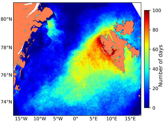 The data availability affects how many eddies could be identified in certain areas during a certain time period. If SST or chl-a image is considered “good” and is subjected to further analysis, it does not mean that the whole swath of the image provides valuable data as a considerable and variable area of the image is often covered by clouds or ice. To account for this variability, the effective data coverage is estimated on a pixel basis as a number of times the pixel contains an ice- and/or cloud-free data in the daily-averaged image (Figure 2). As we consider daily-averaged images then the data coverage could be expressed in days. Initially, a spatial distribution of the data coverage was not similar for SST and chl-a, but, after applying the same cloud-ice mask, the data coverage became identical for the both data sources. Spatial distribution of the data coverage is shown in Figure 2. As seen, the availability of cloud- and ice-free data is highest west of Svalbard where it reaches 70–90 days. In the south, it is about 20–40 days, while it is only about 10 days in the northwestern Greenland Sea which is quasi-permanently covered by fast ice and the wide marginal ice zone [49].