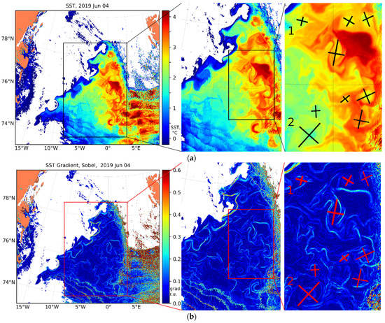 - Based on the daily-averaged SST/chl-a values, horizontal gradients of these properties are calculated using a Sobel operator [57]. The Sobel operator performs a 2-D spatial gradient measurement on an image and so emphasizes regions of high spatial frequency that correspond to edges. The principle involved is that of estimating the gradient of a digitized picture (“density” function or, in our case, SST/chl-a field) at a point by the vector summation of the 4 possible simple central gradient estimates obtained in a 3 × 3 pixel neighborhood. It is a simple and efficient filter that is used to highlight edges and gradients, particularly in the eddy identification process [58,59]. Examples of SST field and corresponding SST gradient with marked eddy axes are presented in Figure 3.