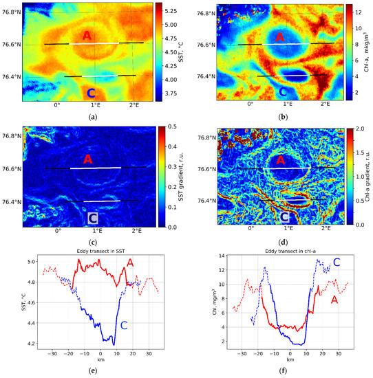 Figure 4 illustrates an identification of an eddy dipole that is manifested in MODIS Aqua SST and chl-a images acquired on 15 June 2019. The core of its anticyclonic part A is warmer and has a lower chl-a concentration than the water on the periphery and outside of it. In turn, the core of cyclone C has rather pronounced negative SST and chl-a anomalies relative to the ambient water. Boundaries of this dipole are also well seen in the corresponding gradient fields (Figure 4c,d), while the variations of SST/chl-a values along the axes allow us to define eddy-induced anomalies in SST/chl-a fields (Figure 4e,f). In this case, we define that the anticyclone A has positive (yet, rather small) SST and negative chl-a anomalies, while the cyclone C has negative SST and chl-a anomalies.