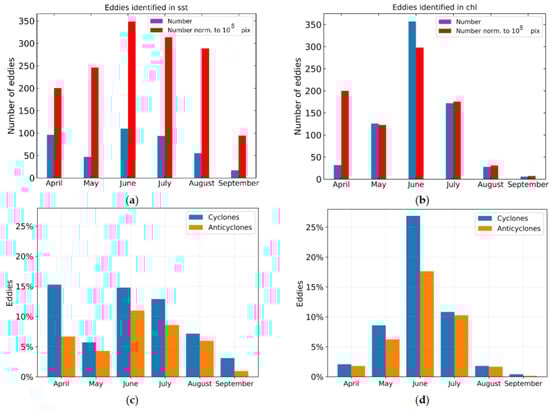 Seasonal variations in the total number of identified eddies do not have an explicit maximum according to SST data and have a clear maximum in June according to chl-a data (Figure 5a,b). Looking at SST data in more detail shows that the total number of eddies also has a maximum in June; however, this peak is not very pronounced (Figure 5a). Slightly lower but similar values are observed in April and July, while a minimal number of eddies are found in September.
