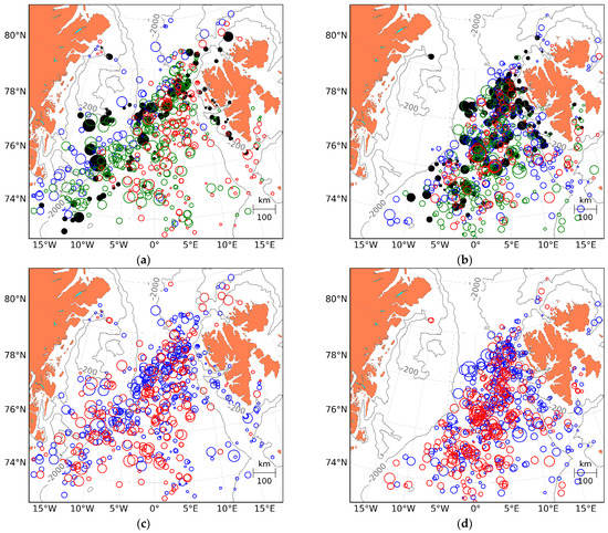 As seen from Figure 12b, about half of the detected eddies propagate northward, especially those found west of Svalbard. The others travel either westward or southward. The obtained eddy translation speeds and directions seem to be in general agreement with previous findings and the overall scheme of circulation regime in this region (see, e.g., [26,28,34]).