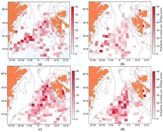 However, the most correct way to identify the true eddy generation hot-spots is to look at spatial maps of the probability of eddies obtained by normalization of the total number of eddies per spatial bin (Figure 7a,b) by the corresponding number of data pixels multiplied by 106 per spatial bin. The resulting probability maps are shown in Figure 7c,d and have some pronounced differences compared to Figure 7a,b. The peak eddy activity in SST data has now shifted to the SW part of the region where the EGC passes along the shelf/slope boundary of the Greenland Sea. High eddy probability values in SST data are also detected at 73.5–74°N, 0–5°E, and in the central Fram Strait at 76.5–80°N, 0–7°E, coinciding with the known locations of the AW recirculation branches [26,28].