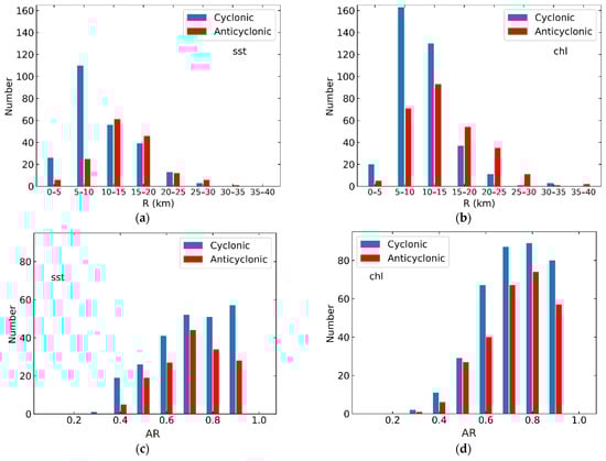 Histogram distributions of eddy radii R (a,b) and aspect ratio of eddy axes AR (c,d) in SST (a,c) and chl-a (b,d) data for cyclonic (blue bars) and anticyclonic (red bars) eddies identified in 2007 and 2018–2020.