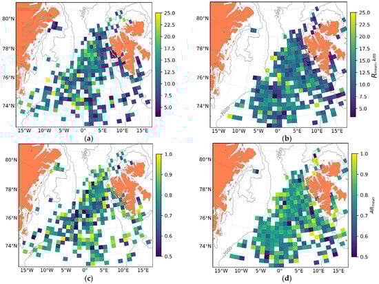 Figure 7a,b show spatial maps with a total number of eddies identified per bin on a horizontal grid of 30 × 30 bin with an average bin size of 40 × 40 km. In both data sources, the highest number of eddies (>10 eddies in SST and >20 eddies in chl-a) is found in the central and northeastern parts of the Fram Strait which potentially coincides with the trajectories of the main boundary currents in the region and recirculation branches of the AW.