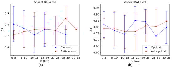 Variations of eddy AR as a funtion of eddy radius according to SST (a) and chl-a (b) data. Averaged in an eddy-radius bin of 5 km. Vertical lines denote one standard deviation.