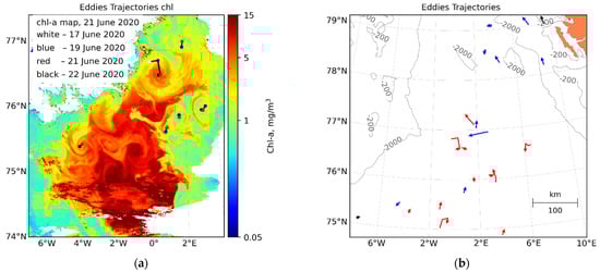 Analysis of eddy translation velocities from sequential MODIS observations: (a) the chl-a map acquired on 21 June 2020, where dots of different color mark locations of eddies at different dates; (b) the total map with trajectories of all eddies tracked in the analysis with red, blue and black arrows showing trajectories of anticyclones, cyclones and eddies with no recognizable rotation sign.