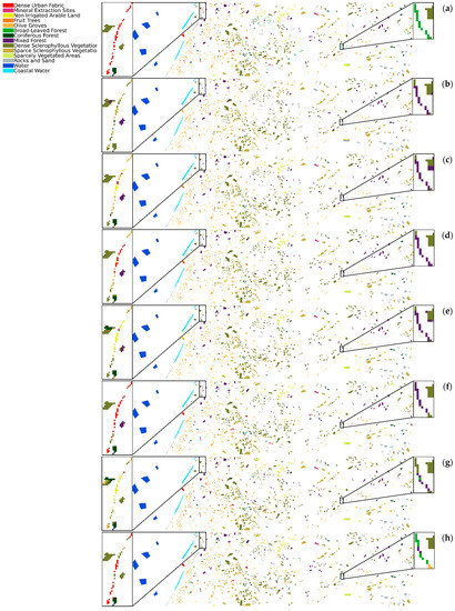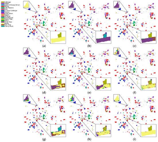 54]; the hyperspectral image to be classified is uniformly divided into a subset of hyperspectral images with a patch size of 5, and the training epoch is set to 200. The training and verification ratio is consistent with SSACT, both of which are 0.1. It should be noted that the samples are randomly selected according to the proportion between different classes, and the situation of class imbalance is retained. The classification result graphs are performed on all sample data.