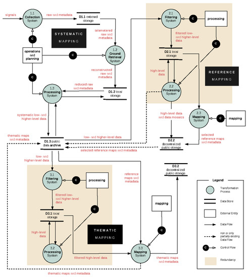 Data flow and data transformation between entities, processes, and storage spaces as observed in systematic mapping, reference mapping, and thematic mapping. Potential resource redundancies are highlighted in boxes. The depiction is an abstract representation of common data transformations. Not all transformation and control processes are representative of each data product as different processing and control tasks exist for each sensor type.
