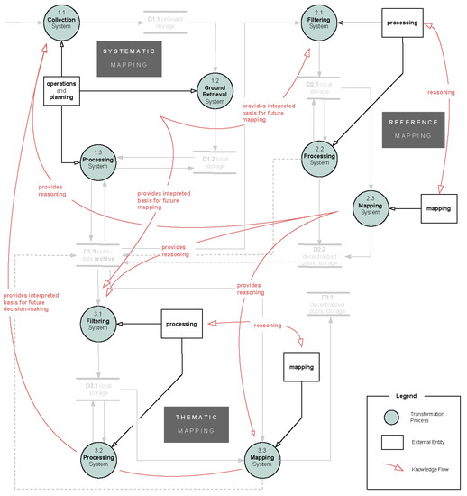 Thematic mapping as the highest level of data interpretation and abstraction requires reasoning based on the reference-mapping process for filtering and for making decisions during the mapping process. In the same way, it is thematic mapping that provides reasoning and scientific context for decision making when it comes to reasoning, mission planning, and mission operation, i.e., systematic mapping (Figure 1 (1.1)).