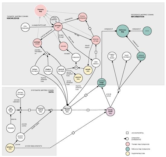 There are various types of use cases for semantic modeling, and they are all distinct from classical data modeling for database designs [35]. Our semantic model comprises data and knowledge transformations as outlined above, and focuses on the compositional character of different mapping processes as well as the final data and map products and their constituents. This semantic model, thus, logically builds on top of data and knowledge flows and provides an additional layer of abstraction. With knowledge about transformations introduced during mapping, we gain a better understanding of the composition of transformative processes. Thus, we also gain a better understanding of data as well as data integrity and accuracy that lead to a certain piece of knowledge. The semantic composition represents the sum of these processes (cf. compositionality) and allows us to generate logical relationships using loose semantic triples. They are considered loose as they could be machine-readable, and they do not follow the convention to be addressable using Uniform Resource Identifier (URI). The connection between a semantic model and a cartographic map is established through the map being represented and implemented as a knowledge base (KB) itself [36]. With a semantic model about map development and compositional constituents in place, the next step allows us to represent each map entity, i.e., mappable feature, through formal semantics, which then allows us to access a larger pool of information and relationships, either by humans or machines [36].