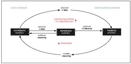 The two aforementioned mapping approaches, i.e., systematic and thematic mapping, center on the cartographic process, and with that comes filtering and abstraction in order to communicate knowledge efficiently. In this paper, we focused on the aspect of filtering, i.e., the selection of input data, as the scientific quality, and derived research values rely on this preselection of data, and we expanded that view by discussing abstraction as a fundamental element for mapping. We then integrated findings of data and knowledge transformations into a more synoptic workflow as described through semantic relationships. In this process, we tried to establish an initial semantic model focused on individual mapping components.