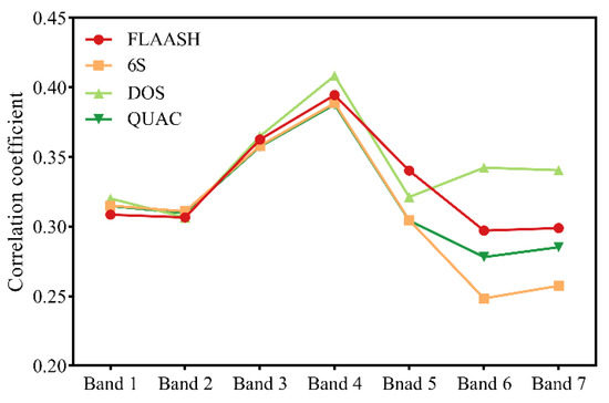| Band Combination | Correlation Coefficient | Band Combination | Correlation Coefficient |