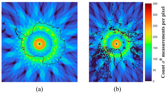 Figure 13a, it can be seen that the data coverages of multisource scatterometer data (i.e., containing at least one scatterometer measurement within the grid cell) as a percentage are above 97% at both half-day and one-day time intervals in both the Antarctic and the Arctic. In