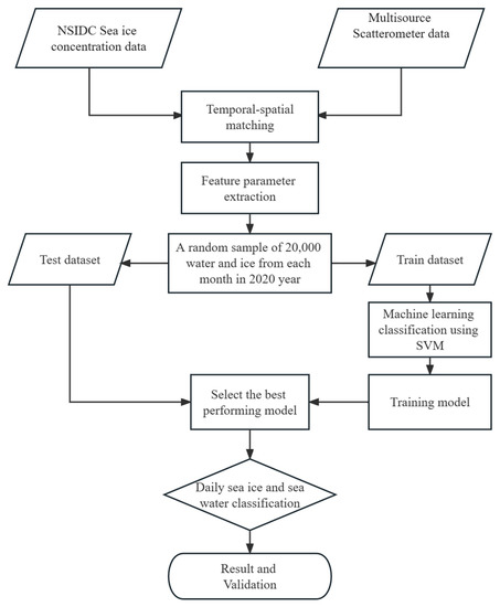 Figure 3 shows the flowchart of sea ice monitoring using the SVM classifier with multisource scatterometer measurements used in this study.