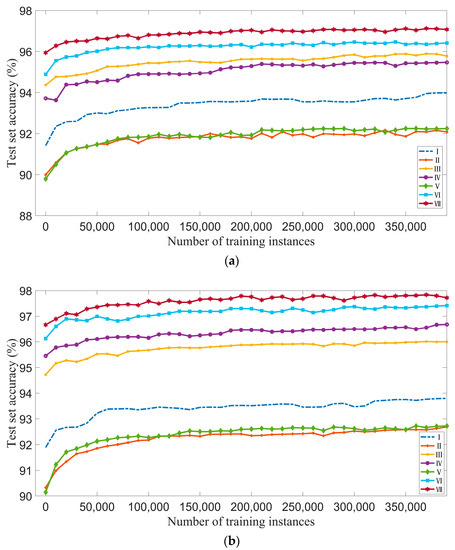 Figure 4a,b show the overall accuracy (OA) of the SVM model derived from the test set in the Arctic for Antarctic, respectively. It can be observed that the OA of the SVM model with only ASCAT as inputs (i.e., experiments II and V) is clearly lower than that of the other models. The OA of the models with data from a single Ku-band (experiments I and IV) scatterometer as inputs is higher than the models with data from a single C-band scatterometer as inputs. The model with only CSCAT data as inputs (experiment IV) performs slightly better than the model with only HSCAT data as inputs (experiment I). For model experiments with joint usage of scatterometer data (experiments III, VI, and VII), the OAs of models with both Ku-band and C-band scatterometer data are higher than those of models using Ku-band or C-band scatterometer data alone. It is noted that, with sufficient training samples, the SVM model with all available scatterometer data as inputs show the best performance among all seven model experiments.