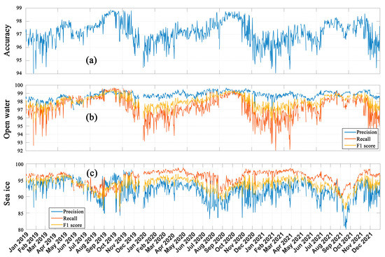 A more detailed evaluation of the selected SVM model (i.e., experiment VII), which inputs all available characteristic parameters from HSCAT, CSCAT, and ASCAT measurements, is performed. Again, we use NSIDC SIC data as reference data. The evaluation indicators include accuracy, precision, recall, and F1 score. The accuracy gives the overall prediction accuracy of the model. The precision is defined as the proportion of correctly predicted samples to total samples. The recall represents the probability of the samples being correctly predicted. The F1 score is an index used to measure the accuracy of a classification model that takes into account both the precision and recall of the classification model.