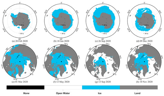 Figure 8e–h, the Arctic Sea ice images for the maximum sea ice extent (01 Mar), retreat (13 May), minimum sea ice extent (13 Sep), and growth (10 Nov) are presented. In addition, the polynyas off the Antarctic coast can also be clearly detected, as shown in