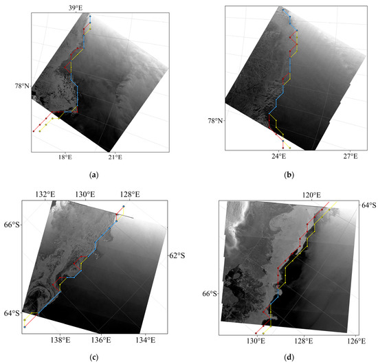 Figure 11c,d show that the SAR image sea ice boundary lies between the multisource scatterometer sea ice boundary and the NSIDC SIC 15% sea ice boundary, and the vast majority of the sea ice boundaries in