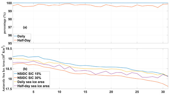 Figure 13b, it can be observed that the half-day sea ice area is in good agreement with the daily sea ice area. The MAD of differences between daily and half-day sea ice areas are 0.088 and 0.131 million km