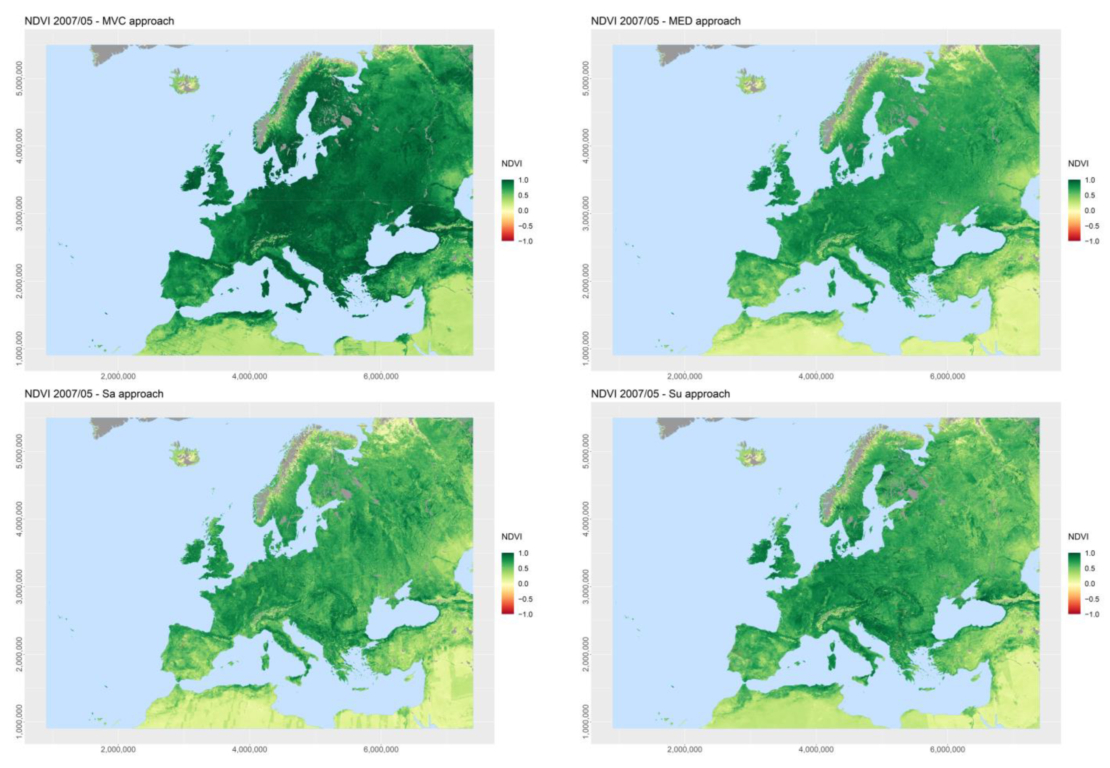 | Maximum Value Compositing | MVC | Established approach: reduces disturbing influences as clouds, snow, and aerosols typically reduce NDVI. | |