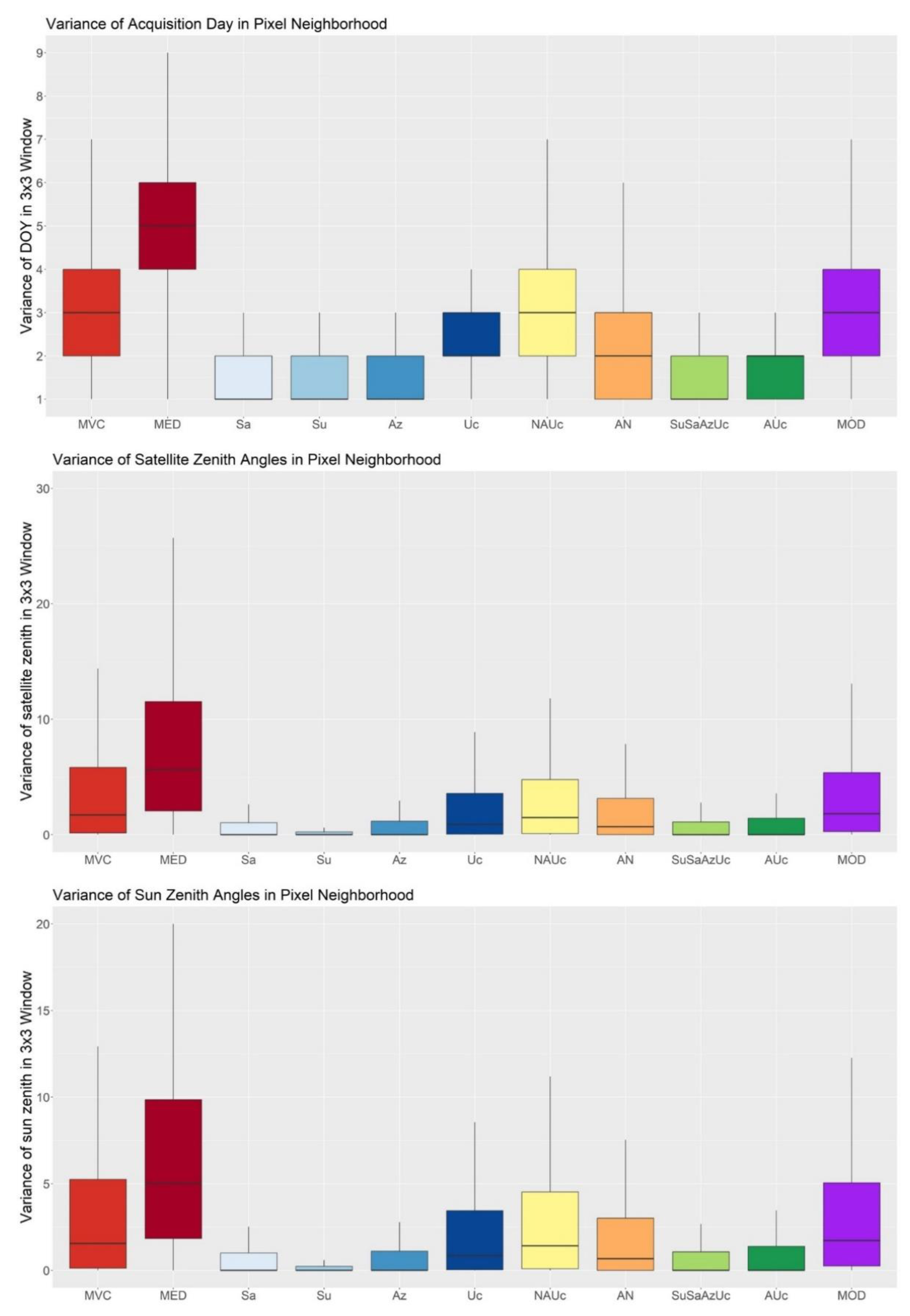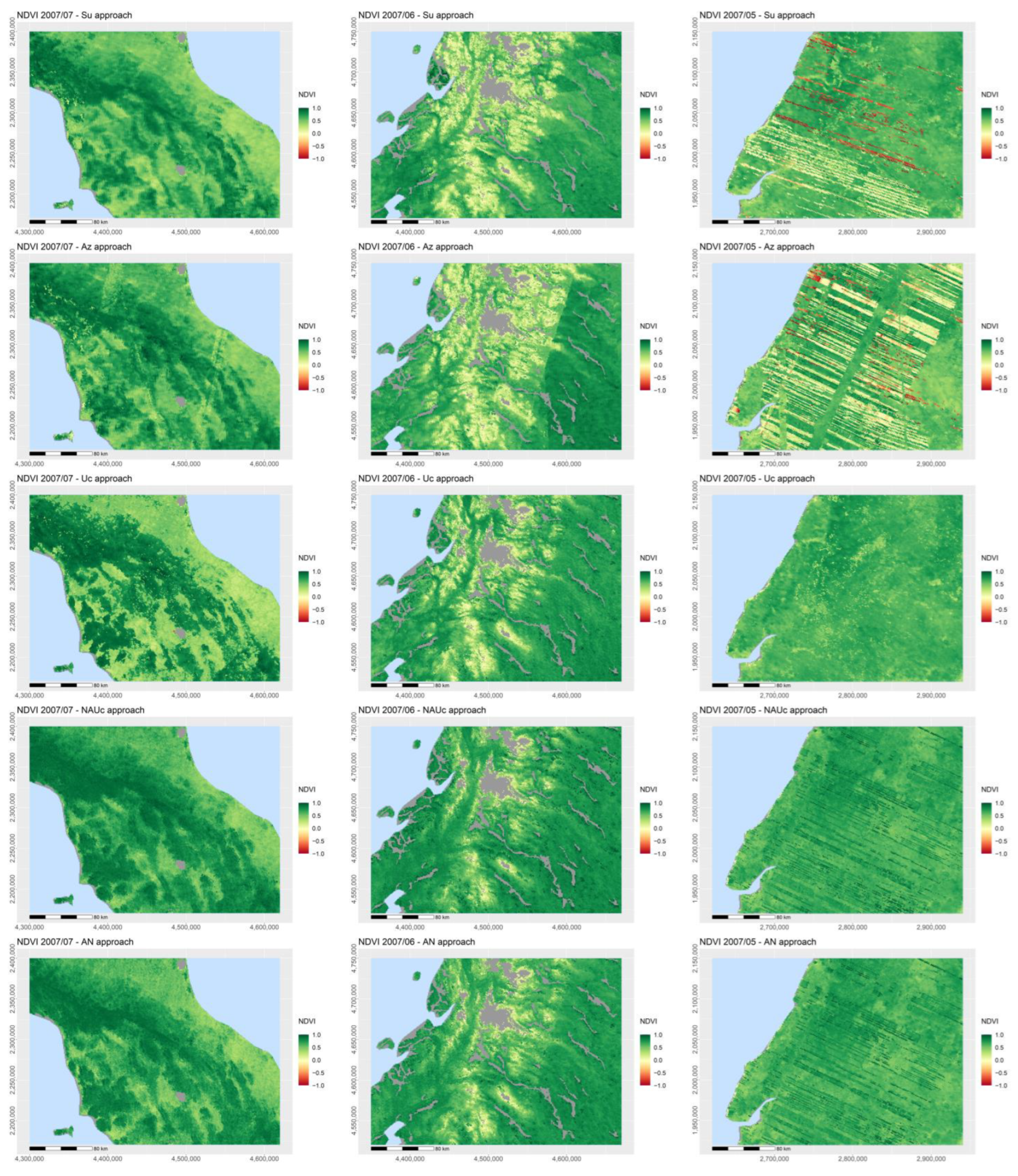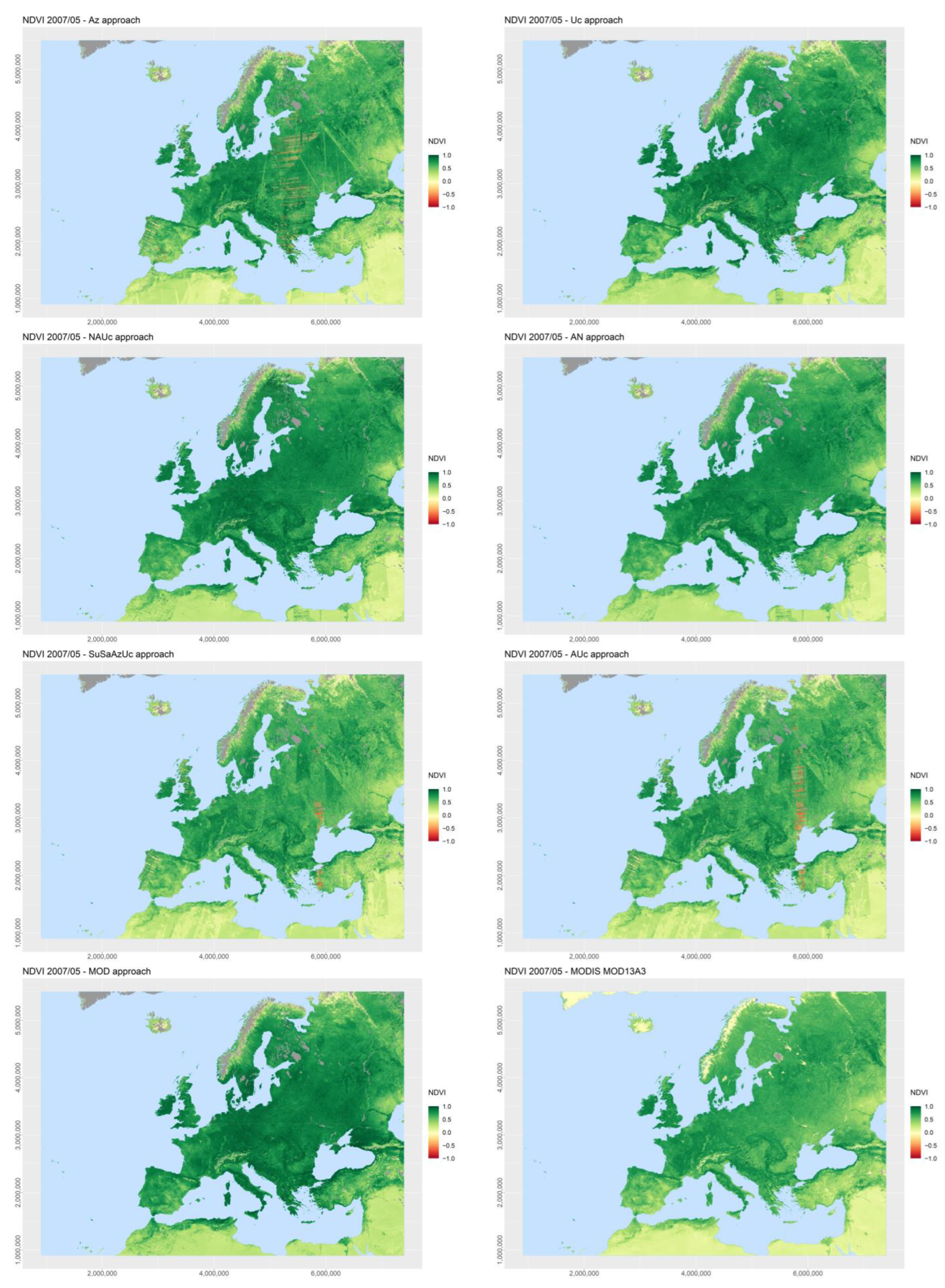 - “SuSaAzUc”: Sun Zenith, Satellite Zenith, Azimuth, and Uncertainty. In this approach, every available criterion but NDVI is considered for selecting the best pixel value. For the score calculation, equal weight is given to each of the four parameters.