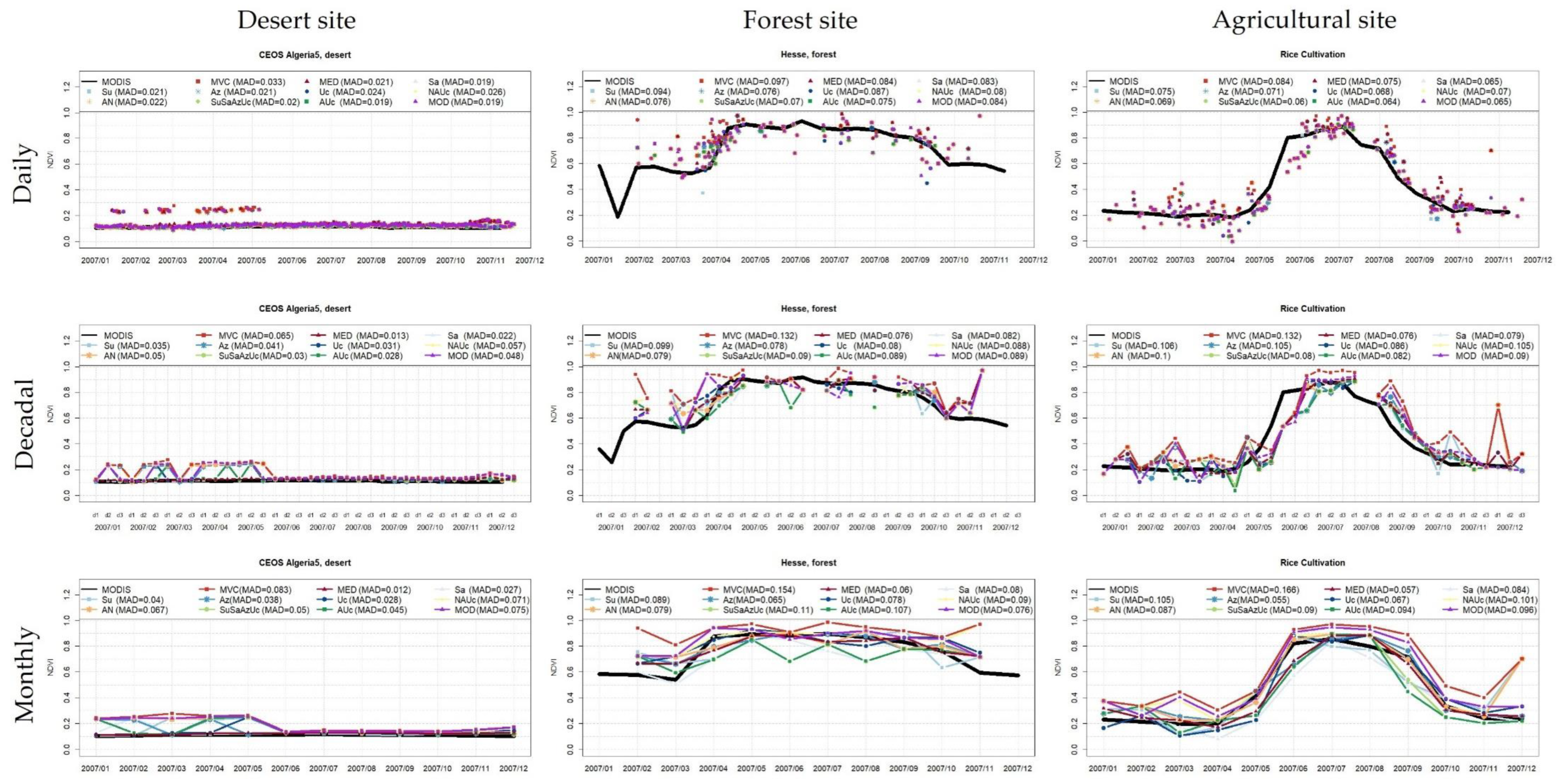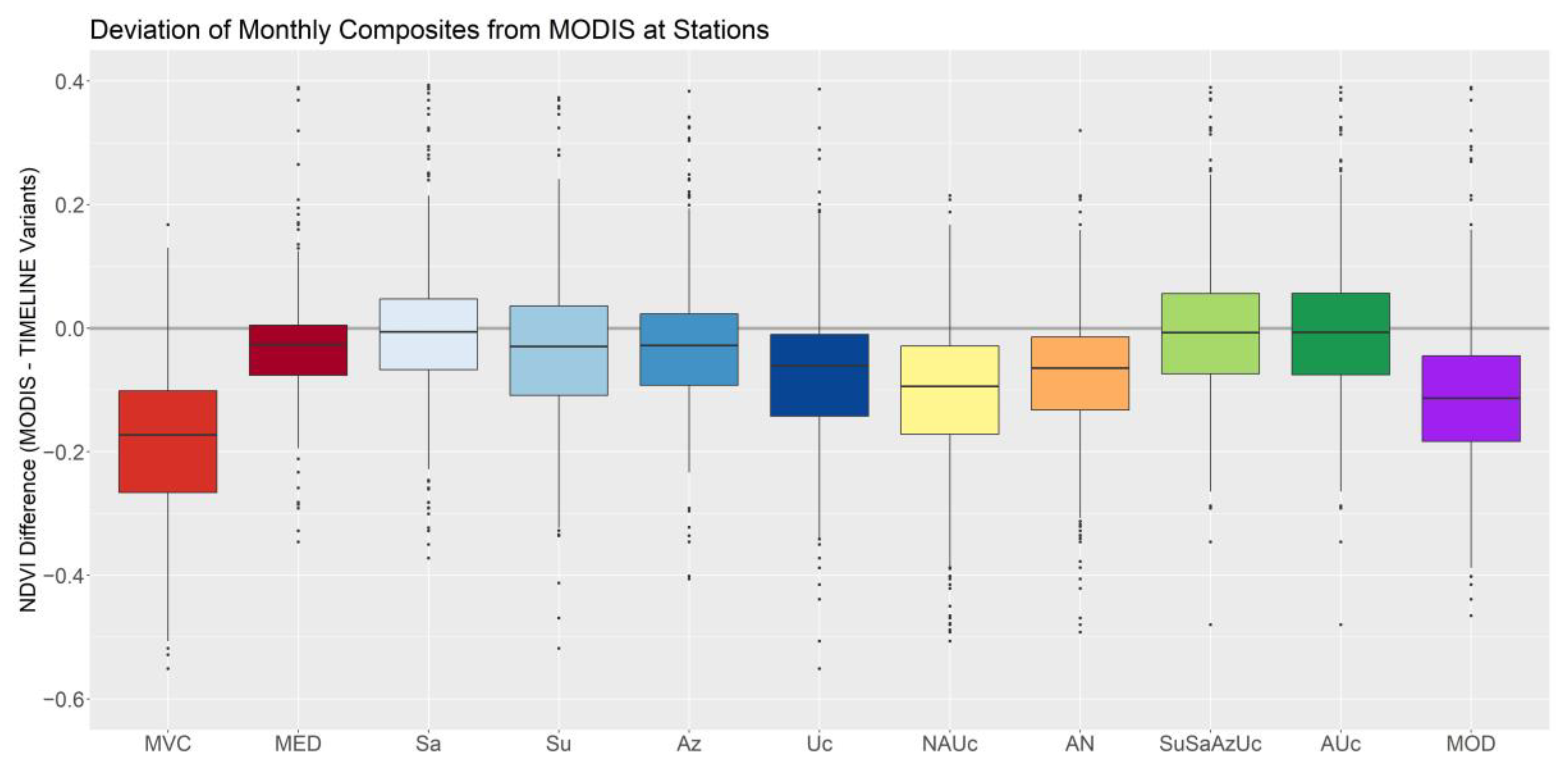 - “MOD”: MODIS Algorithm. The algorithm first selects the two highest NDVI values and in a second step selects of those the observation with the smaller satellite zenith angle, called CV-MVC algorithm [47,49,107]. Additionally, other studies found this stepwise procedure to be most effective [38]. This standard MODIS procedure is included for comparison reasons as a benchmark. However, we adapted it using the four highest NDVI values as “preselection” to account for the longer integrating period and higher number of input data compared to MODIS.