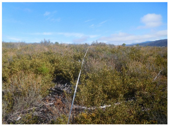 An area of about 115 ha affected by a crown fire was selected for study. In total, 16 experimental plots of radius 20 m were established at random in the area (Figure 2). Two 40 m transects were established perpendicular to the centre of each plot. In each transect, ground cover by the different species present was estimated using the line-intercept method [22]. Total vegetation cover was then calculated for each plot as the sum of cover by each individual species. The number of P. pinaster seedlings and the height of each were determined in 80 1 m2 subplots placed systematically along the transects in each plot. Field measurements were carried out in October 2021.