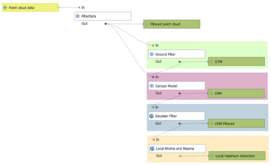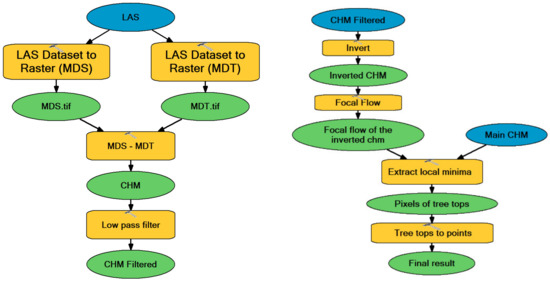 The Arcmap software (10.2) provides accurate tools that allow mapping Lidar points to produce digital terrain models (DTMs) and canopy height models (CHMs). The approach used to detect individual tree crowns was to treat the tree crown as a watershed. Both DTM and digital surface model (DSM) topographic rasters were generated using the LAS to raster data conversion function, with cell size varying between 0.5 m or 0.6 m, considering the average LAS point spacing. Using a value that is between three and four times the average point spacing is recommended to prevent the surface containing cells without data while at the same time not losing surface detail [25]. The CHM was obtained as the vertical difference between the DSM and DTM. Following the workflow shown in Figure 4, a low-pass filter was then applied to smooth and invert the CHM raster. By inverting the raster, we converted the tree canopy into watersheds and the points in the watersheds into holes. The local minima were determined using the focal flux and were finally replaced with the actual heights in the previously generated CHM.