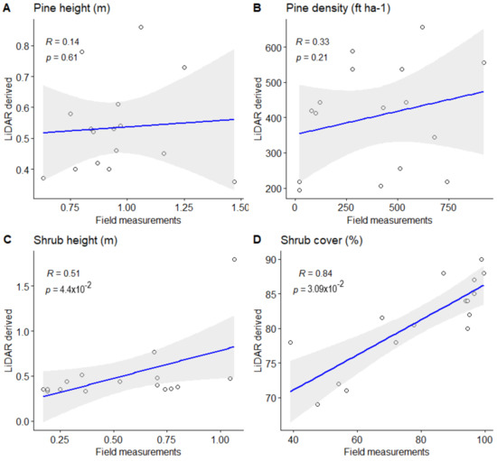 The mean values and standard deviations for all plot parameters measured in the field and estimated by LiDAR are shown in Table 1. The field-measured mean height of the trees was 0.95 m, while the LiDAR-based estimates were 0.90 m and 0.53 m with the ArcMap and FUSION data processing methods, respectively. The pine density was around 400 ft ha−1 (although with high standard deviation values), with a field measurement of 392 ft ha−1 and LiDAR-based estimates of 403 ft ha−1 (FUSION) and 440 ft ha−1 (ArcMap). In the case of shrub height, the field-measured mean value for all plots was 0.55 m, and the LiDAR-based estimates, 0.51 m (FUSION) and 0.83 m (ArcMap).