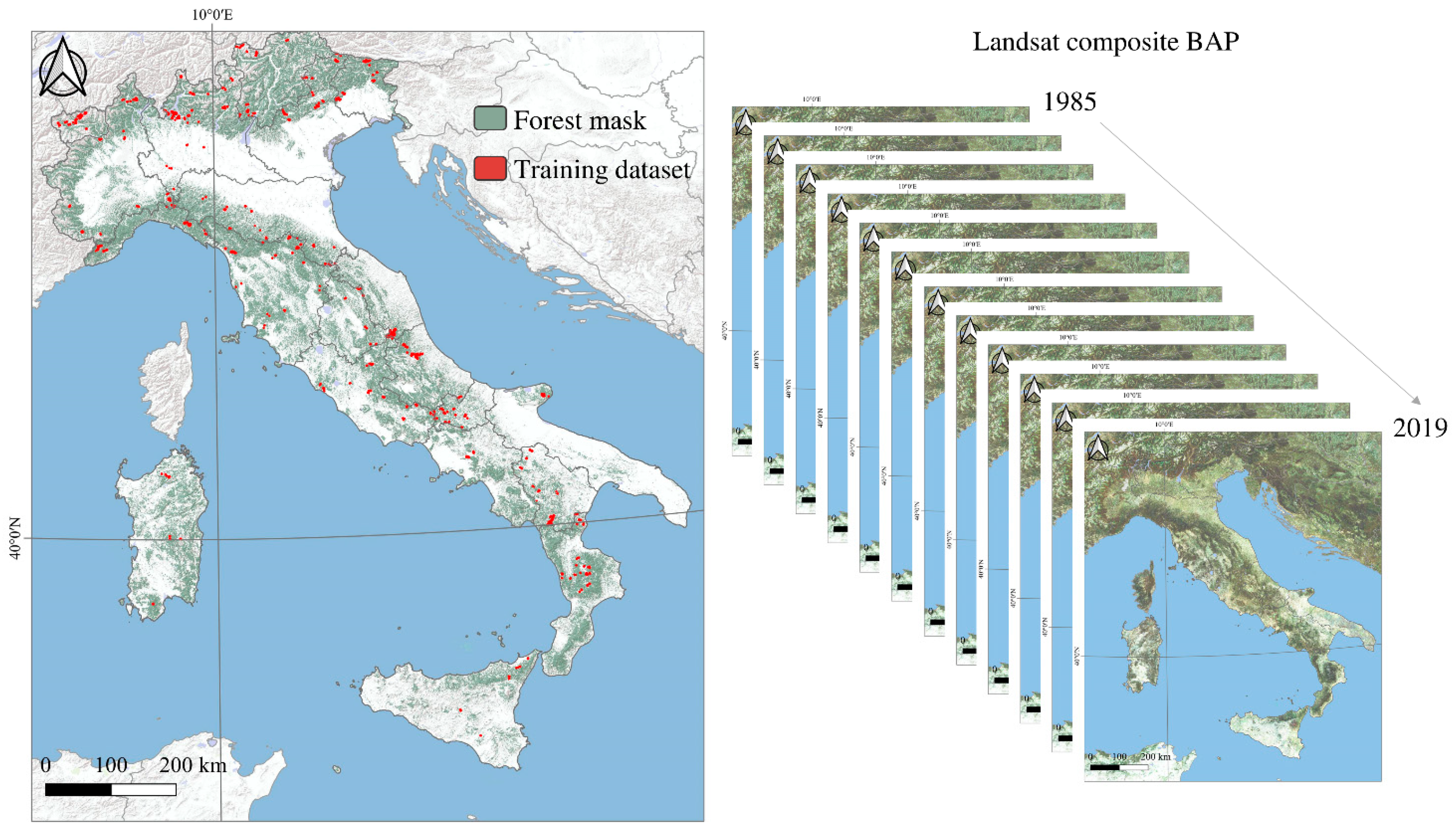 - Cavalli, A.; Francini, S.; McRoberts, R.E.; Falanga, V.; Congedo, L.; de Fioravante, P.; Maesano, M.; Munafò, M.; Chirici, G.; Mugnozza, G.S. Estimating Afforestation Area Using Landsat Time Series and Photointerpreted Datasets. Remote Sens. 2022, 15, 923. [Google Scholar] [CrossRef]