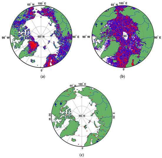 (a,b) Distribution of samples used to build retrieval models on land and ocean under clear sky, respectively. Blue dots represent training samples; red dots represent validation samples. (c) Distribution of 51 radiosonde stations in the Arctic. The red solid dots represent the radiosonde stations.