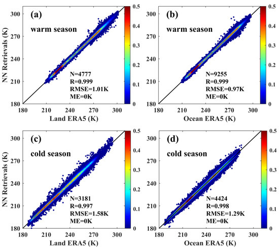 Density scatter diagram of NNs-250 temperature retrievals. (a,b) Retrievals during warm season for temperature on land and ocean, respectively. (c,d) Retrievals during cold season for temperature on land and ocean, respectively.