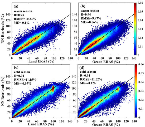 Density scatter diagram of NNs-250 relative humidity retrievals. (a,b) Retrievals during warm season for relative humidity on land and ocean, respectively. (c,d) Retrievals during cold season for relative humidity on land and ocean, respectively.