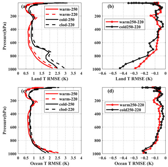 Temperature profile retrieval RMSE, with respect to ERA5. (a,c) Comparisons of RMSE between NNs-250 and NNs-220, (b,d) profile retrieval RMSEs of NNs-250 minus that of NNs-220.