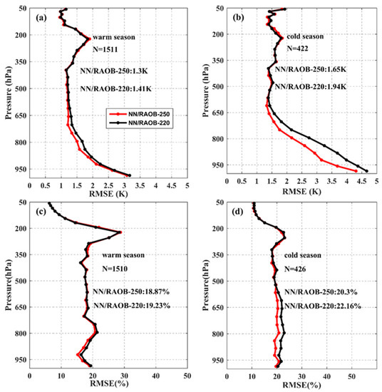 Profile retrieval RMSEs, with respect to RAOBs. (Red lines and black lines represent RMSE of NNs-250 and NNs-220, respectively. (a,b) Temperature RMSE on warm and cold season, respectively, (c,d) relative humidity RMSE on warm and cold season, respectively. RMSE marked in the figure is mean errors from 50 to 1000 hPa.).