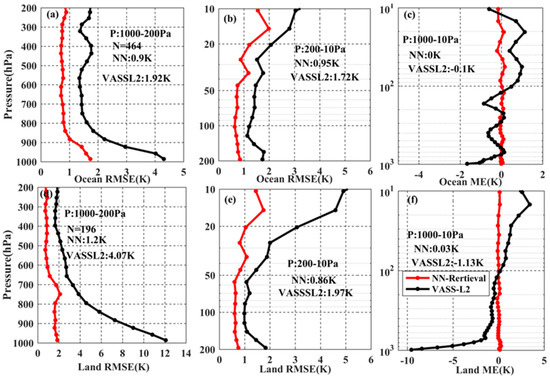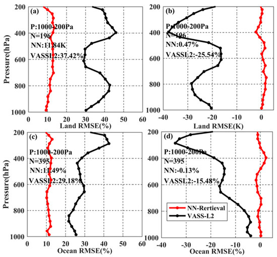 In Figure 11, the black line represents the RMSE of VASS products, and it illustrates that the accuracy needs to be urgently improved. This is reasonable due to the fact that only areas within 60° north–south latitude were included in the operational algorithm. RMSE of FY-3D/VASS L2 products is consistent with that of temperature retrieved from NNs. In the lower troposphere, the retrieval performance is poor, and the temperature inversion accuracy increases with the height. The first column clearly shows the comparison of tropospheric accuracy. The accuracy of the NNs-250 temperature retrievals has been significantly improved. The RMSE of NNs-250 retrievals and FY-3D/VASS products from 200 to 1000 hPa on land are 1.2 K and 4.07 K; the accuracy improved 2.95 K. The RMSE of NNs-250 retrievals and FY-3D/VASS products from 200 to 1000 hPa in the ocean are 0.9 K and 1.92 K; the accuracy improved 1.02 K. The middle column also illustrates that the performance of NNs-250 improved compared with VASS products in stratosphere. The right column shows that the temperature of VASS L2 product is lower than that of ERA5 in the troposphere as a whole, and larger in stratosphere. The ME of temperature retrieved by NNs-250 is about 0 K.