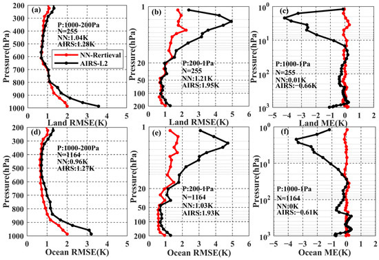 Figure 13 clearly reveals that the RMSE of temperature retrieved by NNs-250 is consistent with that of AIRS L2 temperature products on ocean and land. The first column clearly shows that the accuracy of the temperature retrieved by NNs-250 is equivalent to that of AIRS products in the middle and high troposphere, but the retrieval performance of NNs-250 is better than that of AIRS products below 800 hPa. NNs-250 has obvious advantages compared with AIRS products in the upper stratosphere. Figure 13c, f shows that ME of AIRS L2 (AIRS L2 temperature products minus ERA5 temperature) is less than 0 K, which demonstrates that AIRS L2 temperature products are generally lower than ERA5, and this phenomenon is more obvious in the stratosphere.