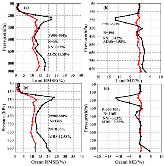 Figure 12 summarizes the RH comparison results. The accuracy of the RH profile retrieved from NNs proposed in this study has been significantly improved compared with the FY-3D/VASS L2 product. The RMSE of the RH from 200 to 1000 pHa on land decreased from 37.42 to 11.84%. The RMSE of RH reduced from 29.18 to 11.49% in the ocean. The FY-3D/VASS L2 relative humidity product is smaller than that of ERA5 in troposphere. The ME of RH inversion by NNs-250 is less than 1%.