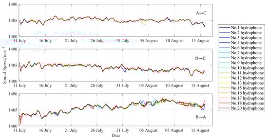 In this experiment, 20 hydrophones were attached to the mooring line vertically at depths near the sound channel axis. Figure 7a–c shows that the variation in sound velocity with time obtained from the array received by the 20 hydrophones is very consistent whether they are received from station C and transmitted from station A (Figure 7a)/D (Figure 7b) or received from station A and transmitted from station B (Figure 7c). To demonstrate this consistency, the correlation coefficients are calculated between different hydrophones, except for the malfunction of the No. 5, 14, and 19 hydrophones, the correlation coefficients of the time series are more than 0.97. Therefore, we only need to choose the time series of one hydrophone for analysis (hereinafter the second hydrophone).