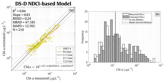 The evaluation of this weighted combination is provided in Figure 13. It is worth mentioning that the number of points presented in Figure 13 (N = 147) corresponds to the maximal number of points in DS-V with available information from the visible to the NIR for samples corresponding to OWTs 1, 2, 3, and 4. An overall good performance is found for the MUBR-NDCI-based combination (MAPD = 21.64%, RMSD = 0.25).