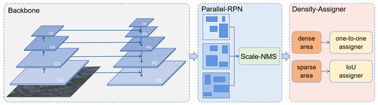 In this paper, a specific vehicle detection framework for aerial images is proposed. Firstly, anchors are generated on different FPN layers and set position by Parallel RPN. Furthermore, these anchors are screened out to a fixed number in scale-based NMS and form a proposal list. The proposals are then assigned to ground truth in the R-CNN stage by a density-based assigning strategy. Figure 1 shows the architecture of the proposed vehicle detection framework. A detailed description and the motivation for the proposed work are given in the following sections.