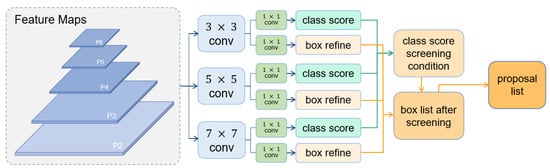 Given that the feature map sizes of different FPN layers vary by multiple, the deduced receptive field of different layers changes discretely, leading to the large gap between the receptive field size between adjacent FPN layers. However, the vehicle size approximates a continuous change in the aerial imagery; therefore, the discretely changed receptive field is not fine enough to handle the vehicle size variance. As a result, the choice of proposals from different convolutional kernels should also be adjusted dynamically according to the specific situation. In the traditional structure of RPN, proposals are generated together with classification scores (confidence). However, once the final proposals are chosen by their rankings, the scores will never be used again.
